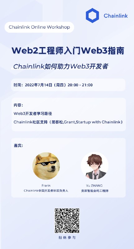 同时Chainlink开发者社区中国负责人Frank还会介绍Chainlink开发者社区可以给开发者带来哪些支持,扫描图中的二维码加入社区吧!